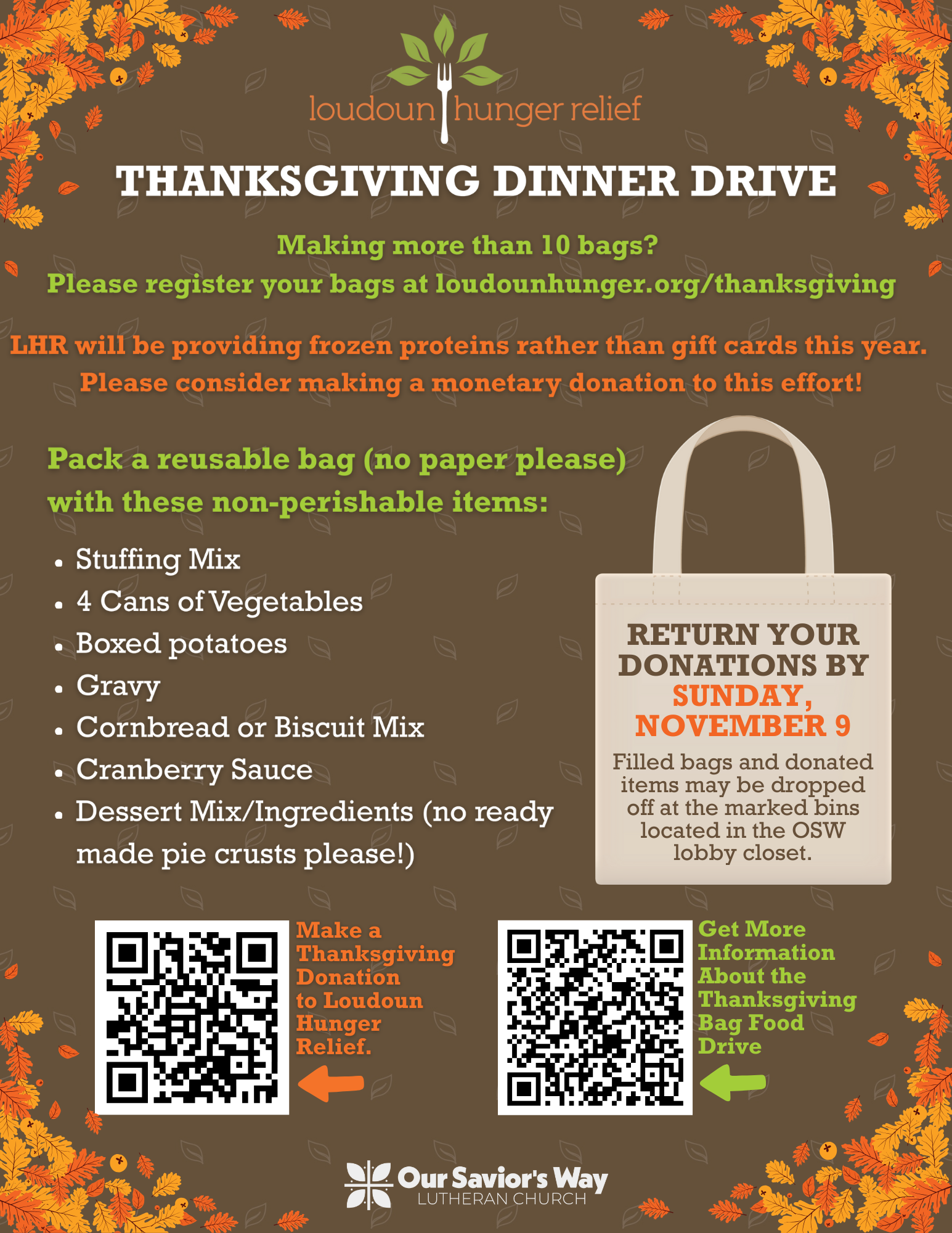 The social ministry is holding our annual food drive to build Thanksgiving dinner bags for Loudoun Hunger Relief. Each bag provides a family with a meal this Thanksgiving.